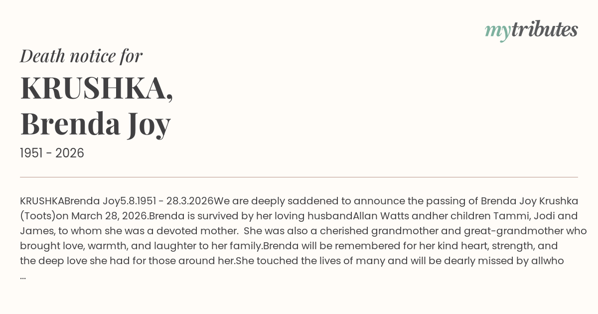 We are deeply saddened to announce the passing of Brenda Joy Krushka (Toots)