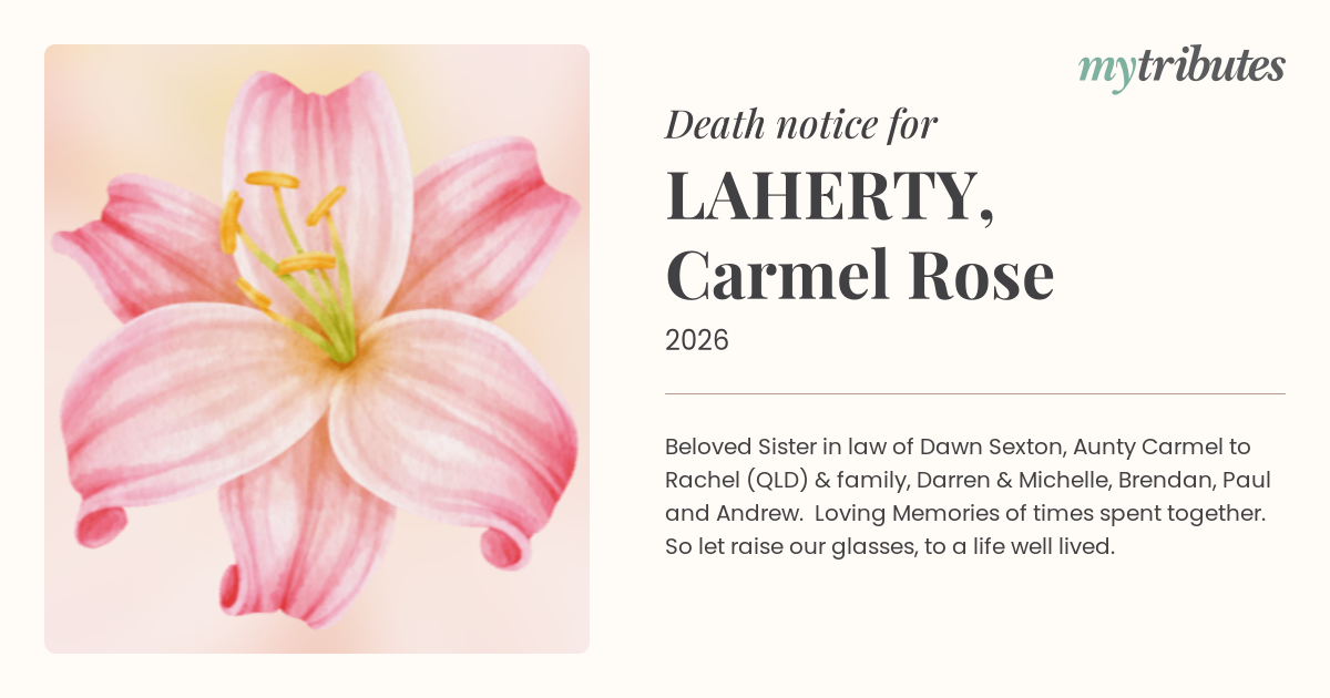 19°CBeloved Sister in law of Dawn Sexton, Aunty Carmel to Rachel (QLD) & family, Darren & Michelle, Brendan, Paul and Andrew. Loving Memories of times spent together. So let raise our glasses, to a life well lived.