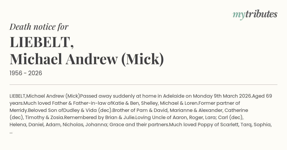 Passed away suddenly at home in Adelaide on Monday 9th March 2026.