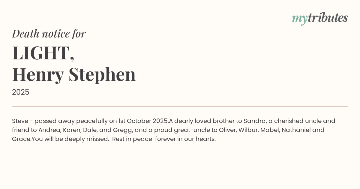 A dearly loved brother to Sandra, a cherished uncle and friend to Andrea, Karen, Dale, and Gregg, and a proud great-uncle to Oliver, Wilbur, Mabel, Nathaniel and Grace.