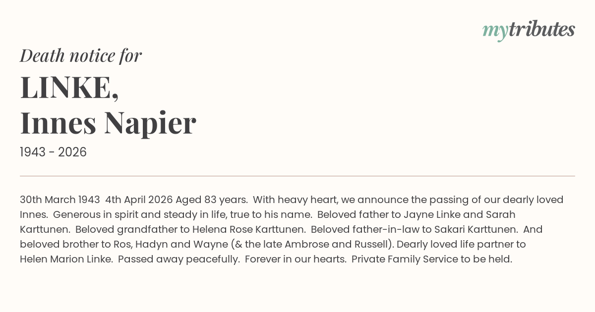Beloved father to Jayne Linke and Sarah Karttunen.