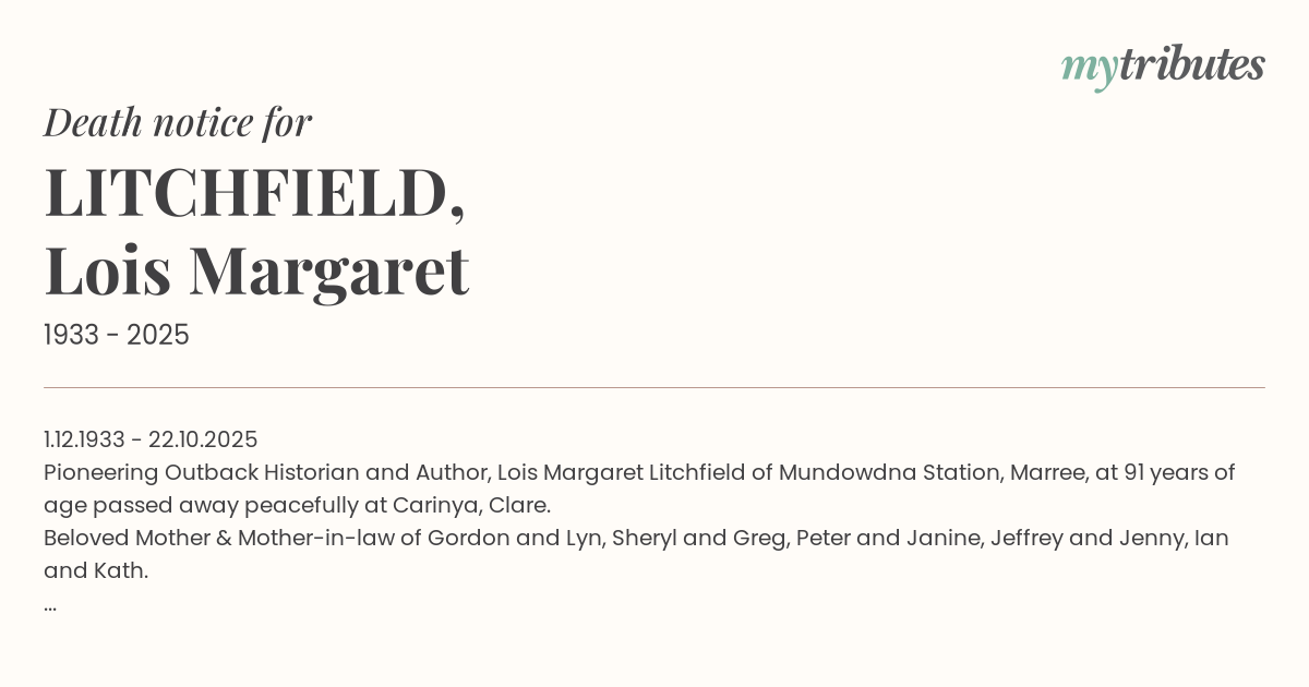 Pioneering Outback Historian and Author, Lois Margaret Litchfield of Mundowdna Station, Marree, at 91 years of age passed away peacefully at Carinya, Clare.