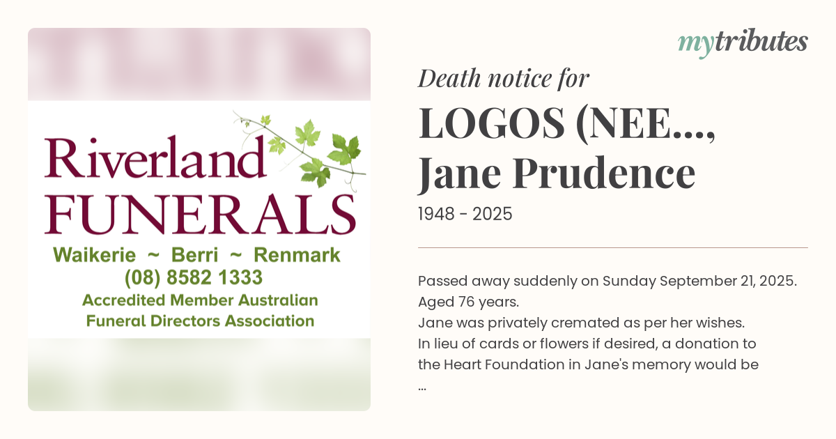 In lieu of cards or flowers if desired, a donation to the Heart Foundation in Jane's memory would be appreciated.