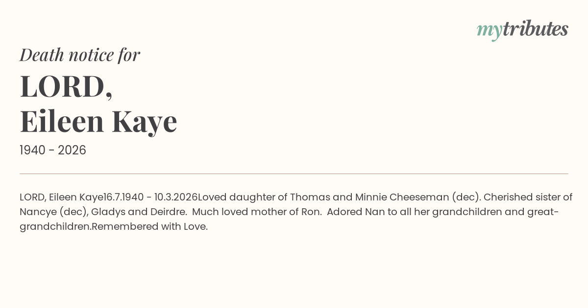 Loved daughter of Thomas and Minnie Cheeseman (dec). Cherished sister of Nancye (dec), Gladys and Deirdre. Much loved mother of Ron. Adored Nan to all her grandchildren and great-grandchildren.