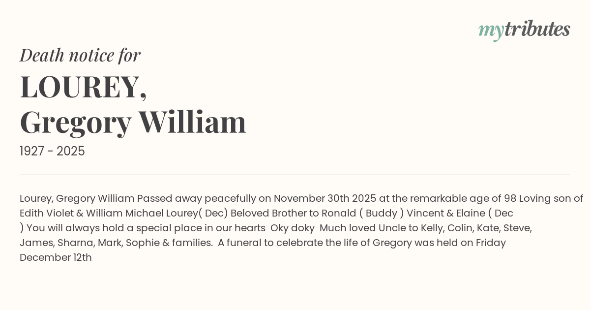 19°CLourey, Gregory William Passed away peacefully on November 30th 2025 at the remarkable age of 98 Loving son of Edith Violet & William Michael Lourey