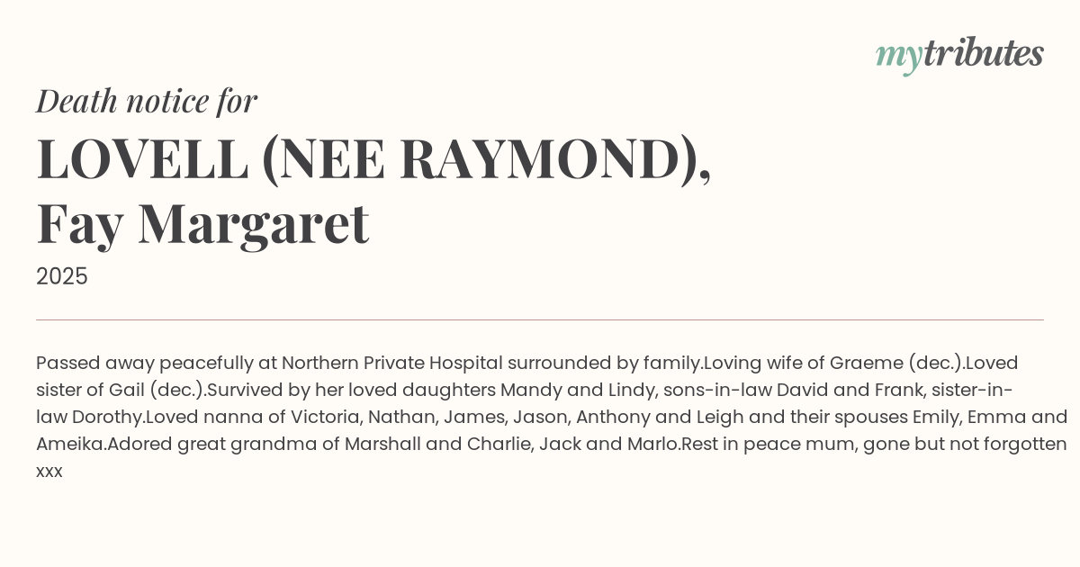 19°CPassed away peacefully at Northern Private Hospital surrounded by family.
