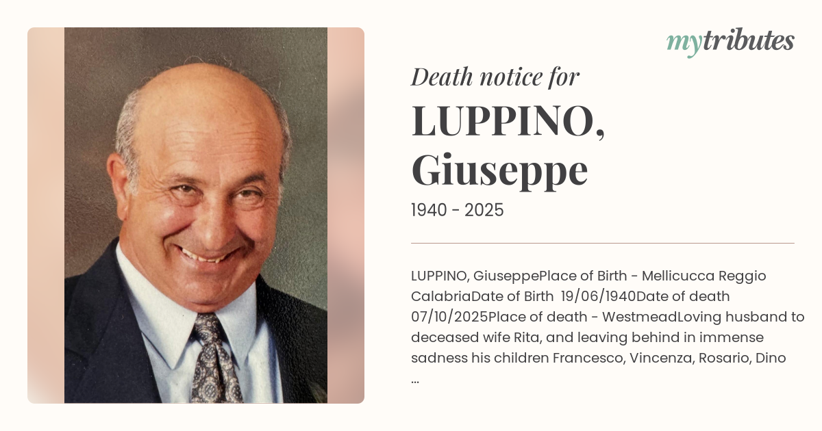 Loving husband to deceased wife Rita, and leaving behind in immense sadness his children Francesco, Vincenza, Rosario, Dino and Belinda & family.