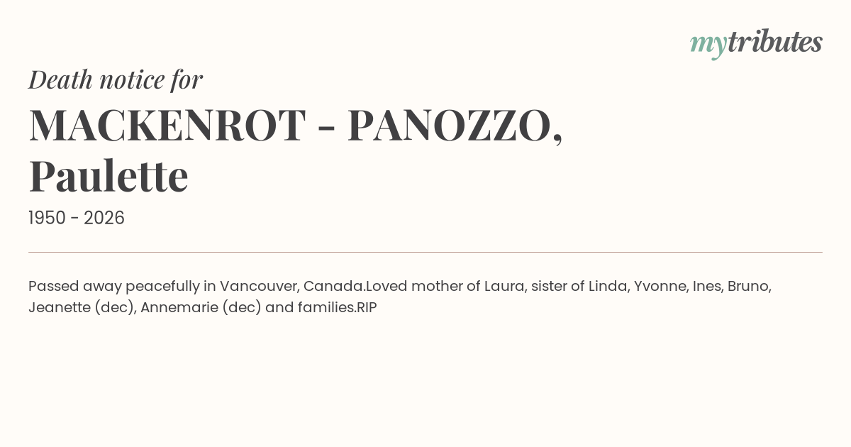 Loved mother of Laura, sister of Linda, Yvonne, Ines, Bruno, Jeanette (dec), Annemarie (dec) and families.