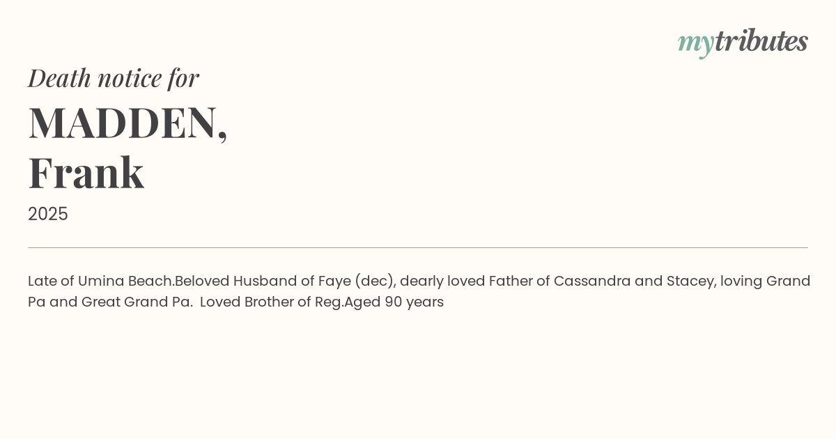 Beloved Husband of Faye (dec), dearly loved Father of Cassandra and Stacey, loving Grand Pa and Great Grand Pa. Loved Brother of Reg.