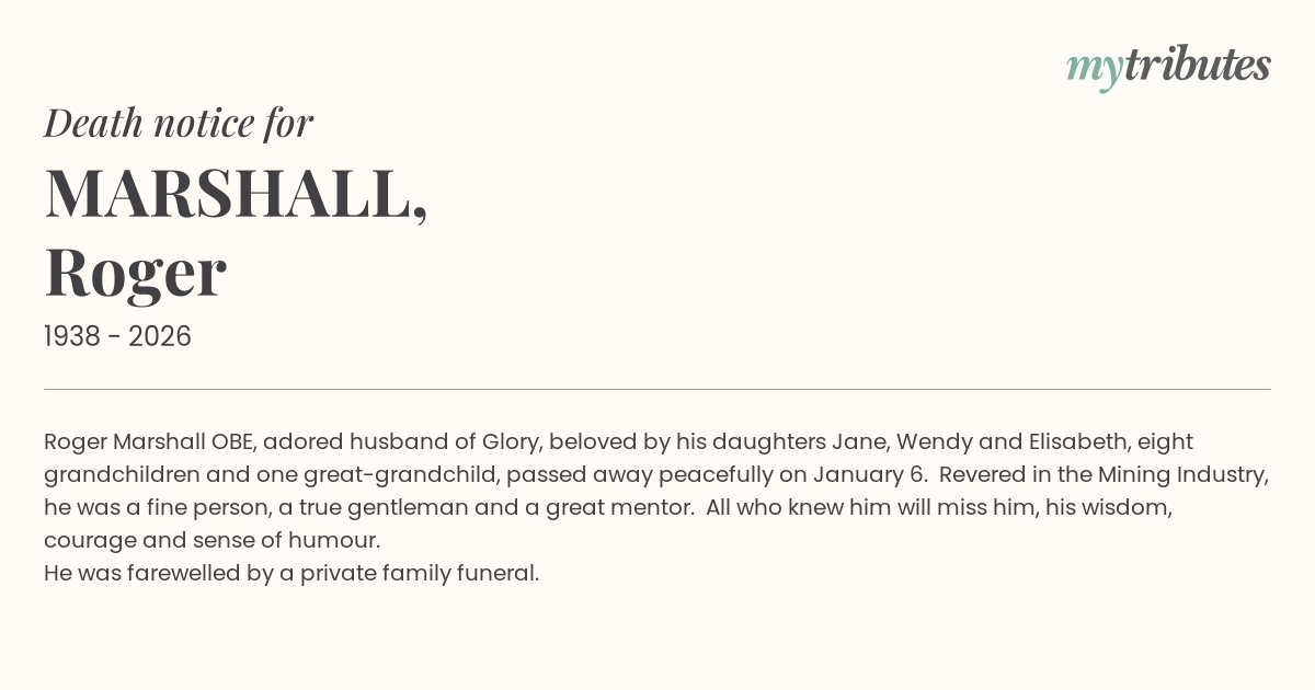 19°CRoger Marshall OBE, adored husband of Glory, beloved by his daughters Jane, Wendy and Elisabeth, eight grandchildren and one great-grandchild, passed away peacefully on January 6. Revered in the Mining Industry, he was a fine person, a true gentleman and a great mentor. All who knew him will miss him, his wisdom, courage and sense of humour.