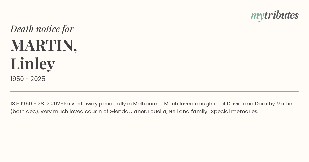 Passed away peacefully in Melbourne. Much loved daughter of David and Dorothy Martin (both dec). Very much loved cousin of Glenda, Janet, Louella, Neil and family. Special memories.