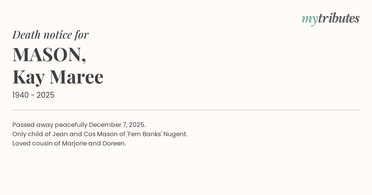 Only child of Jean and Cos Mason of 'Fern Banks' Nugent.