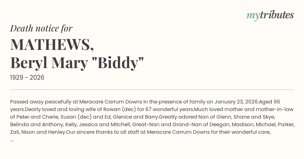 19°CPassed away peacefully at Meracare Carrum Downs in the presence of family on January 23, 2026.