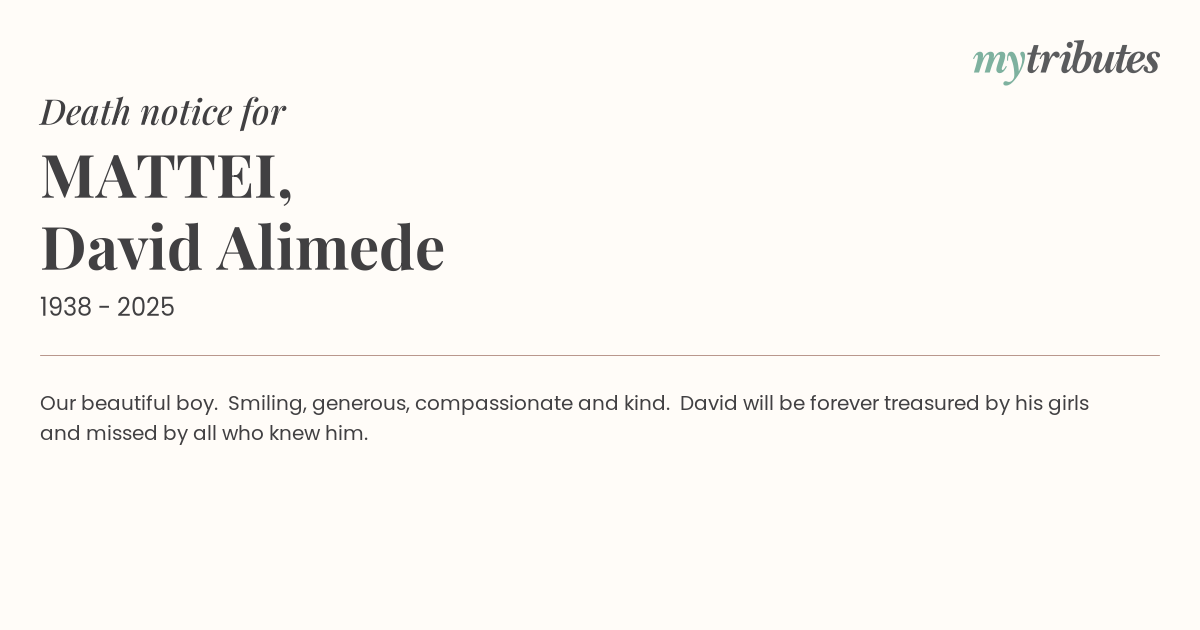 19°COur ‘beautiful boy’. Smiling, generous, compassionate and kind. David will be forever treasured by his girls and missed by all who knew him.