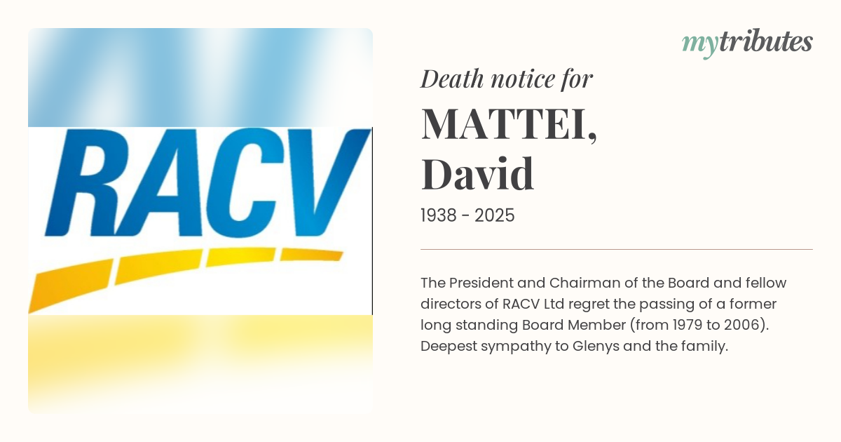 19°CThe President and Chairman of the Board and fellow directors of RACV Ltd regret the passing of a former long standing Board Member (from 1979 to 2006). Deepest sympathy to Glenys and the family.