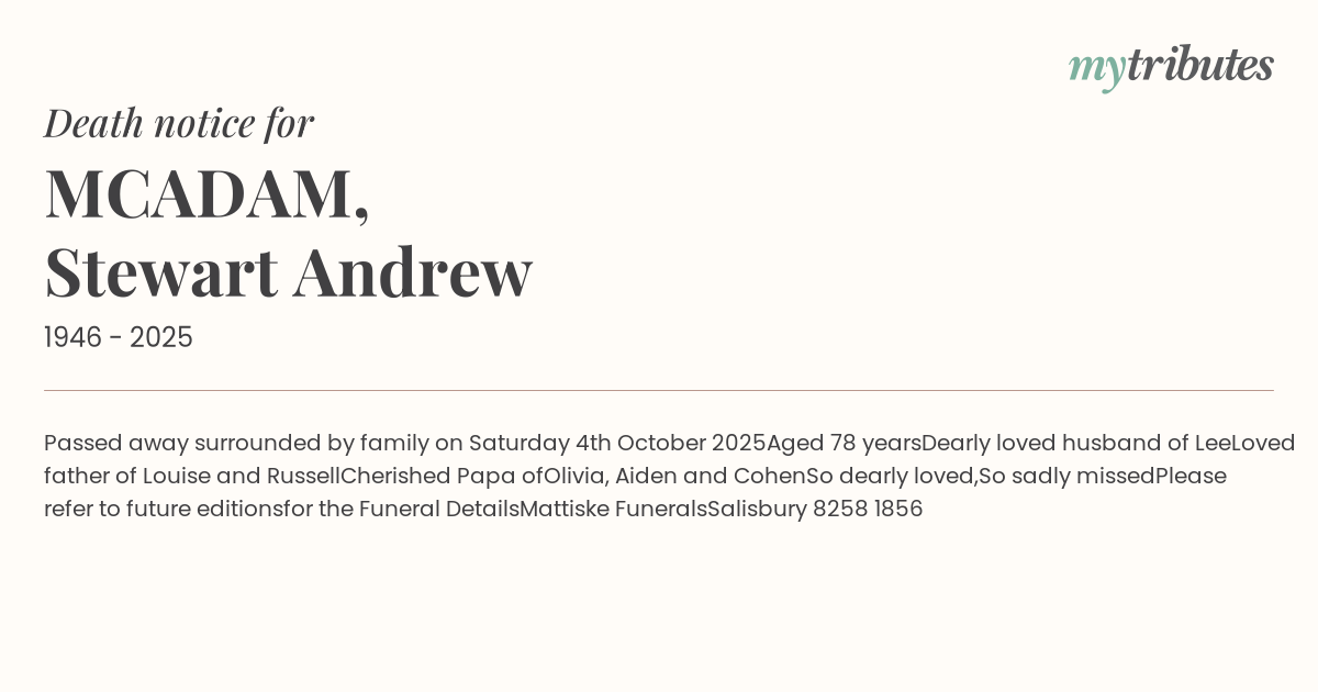 19°CPassed away surrounded by family on Saturday