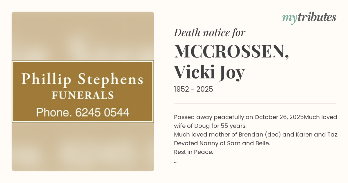 19°CPassed away peacefully on October 26, 2025Much loved wife of Doug for 55 years.