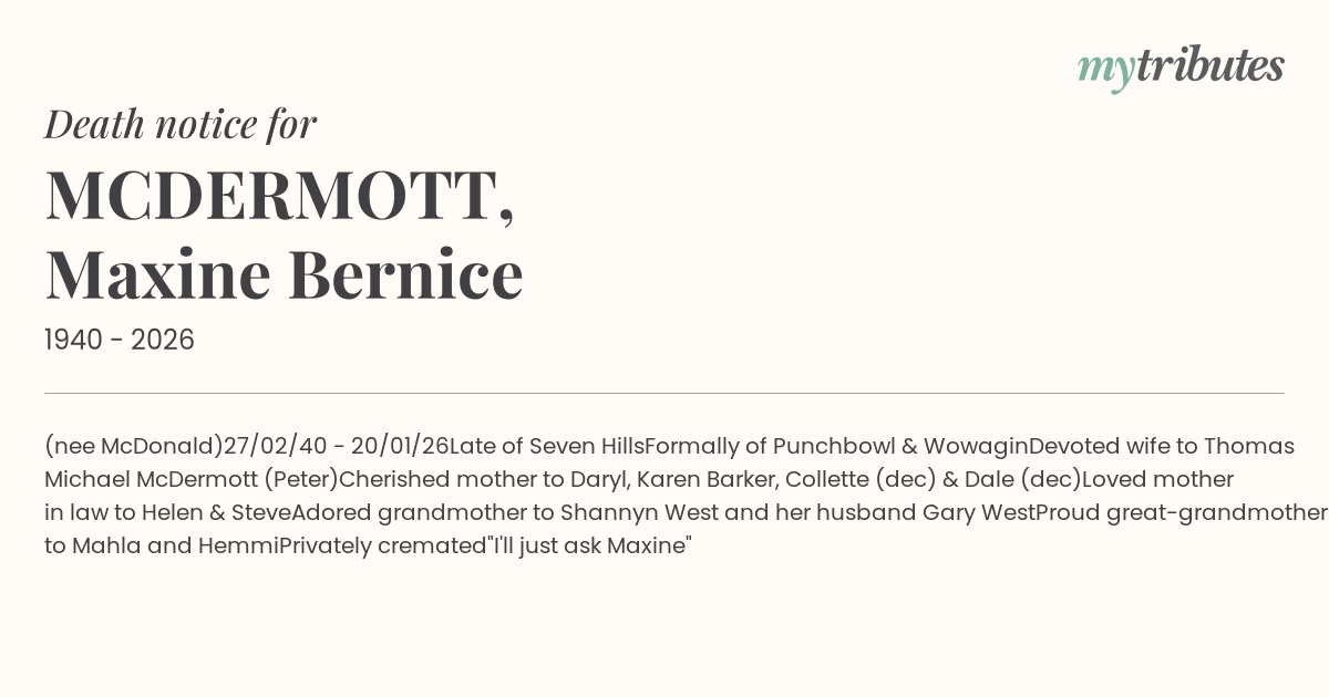 Cherished mother to Daryl, Karen Barker, Collette (dec) & Dale (dec)