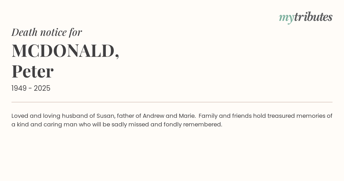 19°CLoved and loving husband of Susan, father of Andrew and Marie. Family and friends hold treasured memories of a kind and caring man who will be sadly missed and fondly remembered.