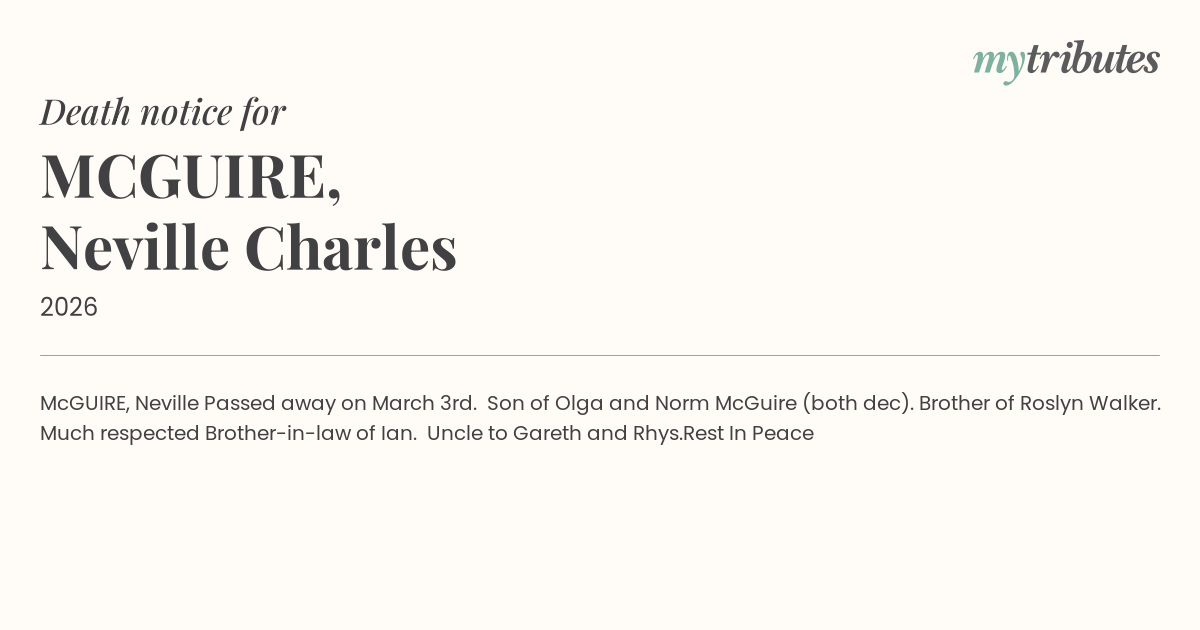Passed away on March 3rd. Son of Olga and Norm McGuire (both dec). Brother of Roslyn Walker. Much respected Brother-in-law of Ian. Uncle to Gareth and Rhys.