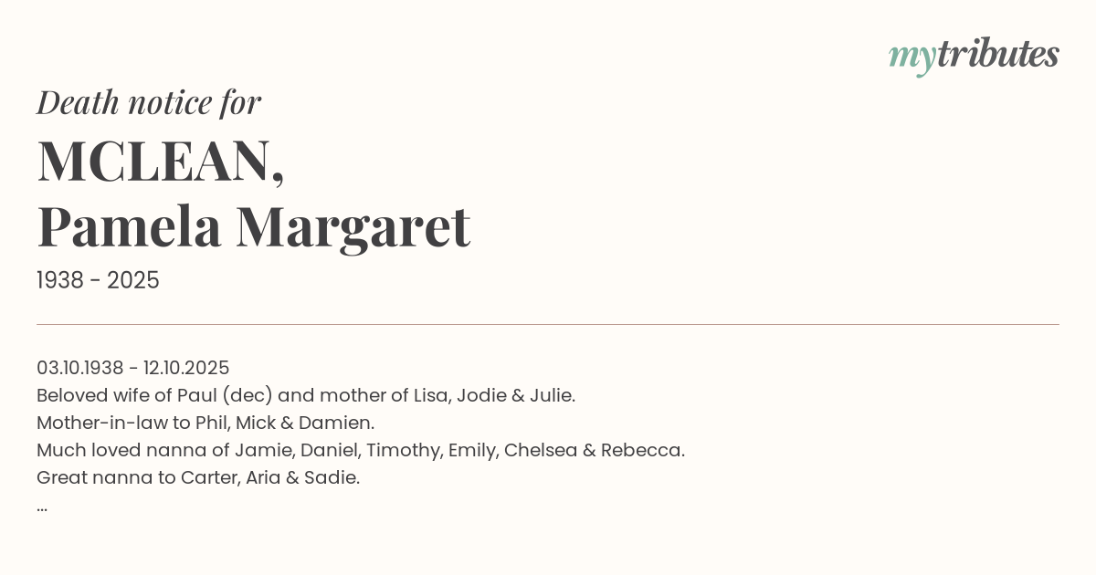 Much loved nanna of Jamie, Daniel, Timothy, Emily, Chelsea & Rebecca.