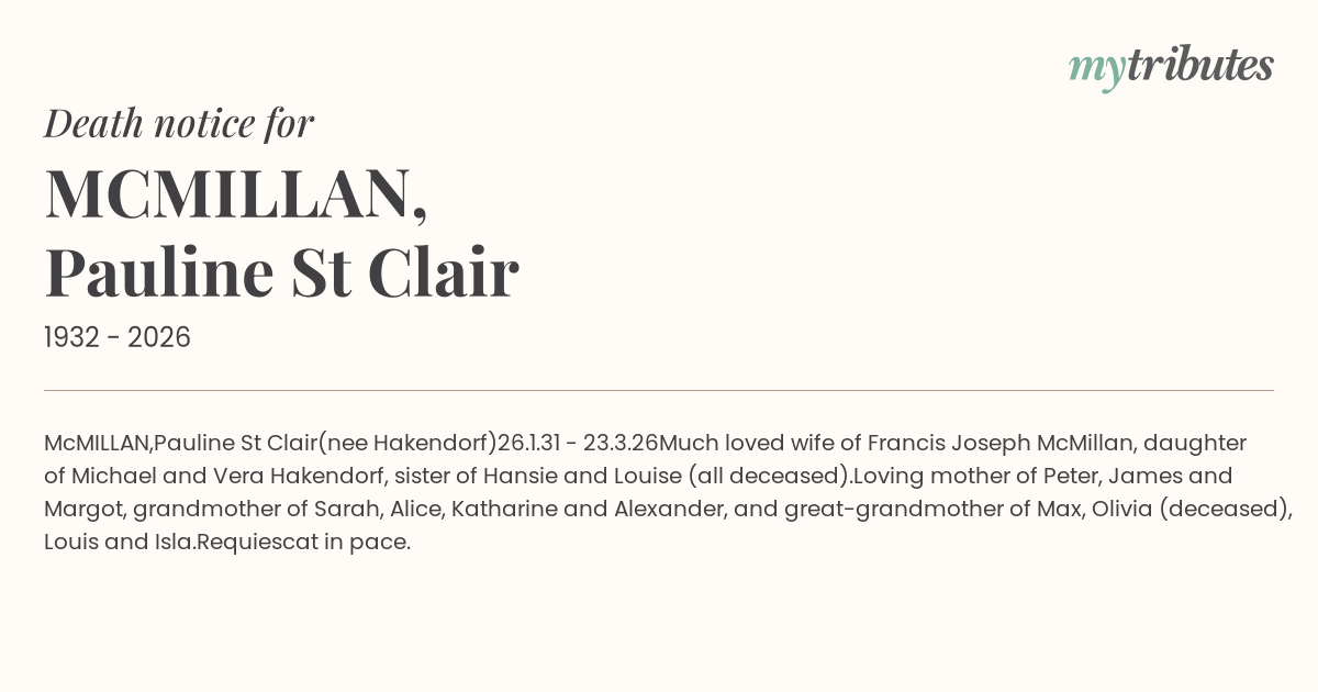 Much loved wife of Francis Joseph McMillan, daughter of Michael and Vera Hakendorf, sister of Hansie and Louise (all deceased).