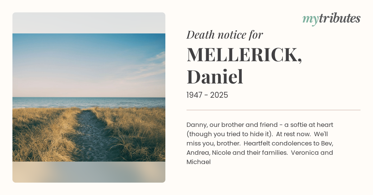 19°CDanny, our brother and friend - a softie at heart (though you tried to hide it). At rest now. We'll miss you, brother. Heartfelt condolences to Bev, Andrea, Nicole and their families. Veronica and Michael