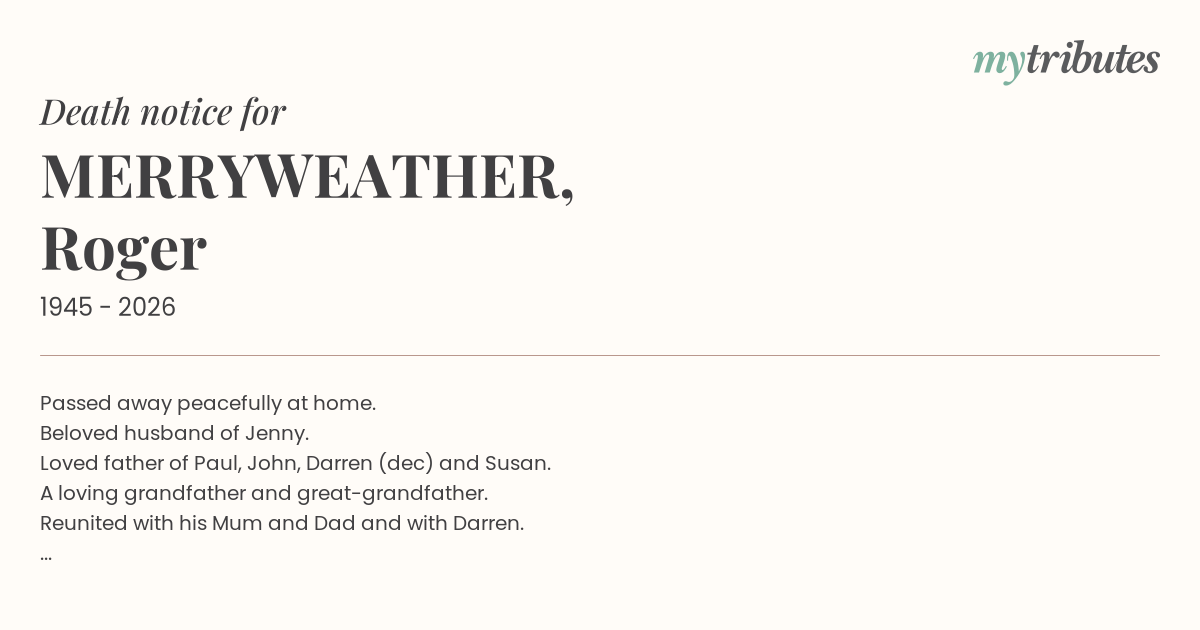 19°CPassed away peacefully at home. Beloved husband of Jenny. Loved father of Paul, John, Darren (dec) and Susan. A loving grandfather and great-grandfather. Reunited with his Mum and Dad and with Darren. Rest In Peace