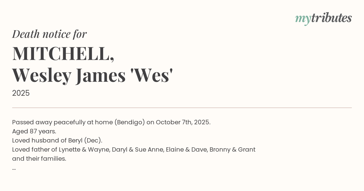 19°CPassed away peacefully at home (Bendigo) on October 7th, 2025.