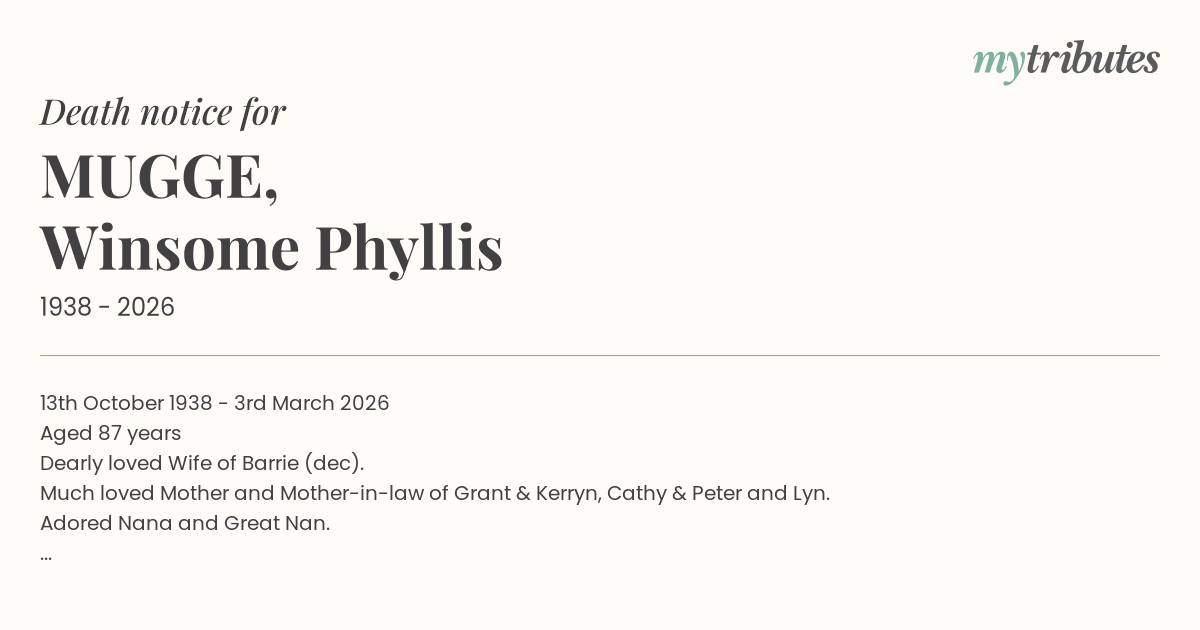 19°C13th October 1938 - 3rd March 2026 Aged 87 years Dearly loved Wife of Barrie (dec). Much loved Mother and Mother-in-law of Grant & Kerryn, Cathy & Peter and Lyn. Adored Nana and Great Nan. "Reunited with Barrie"