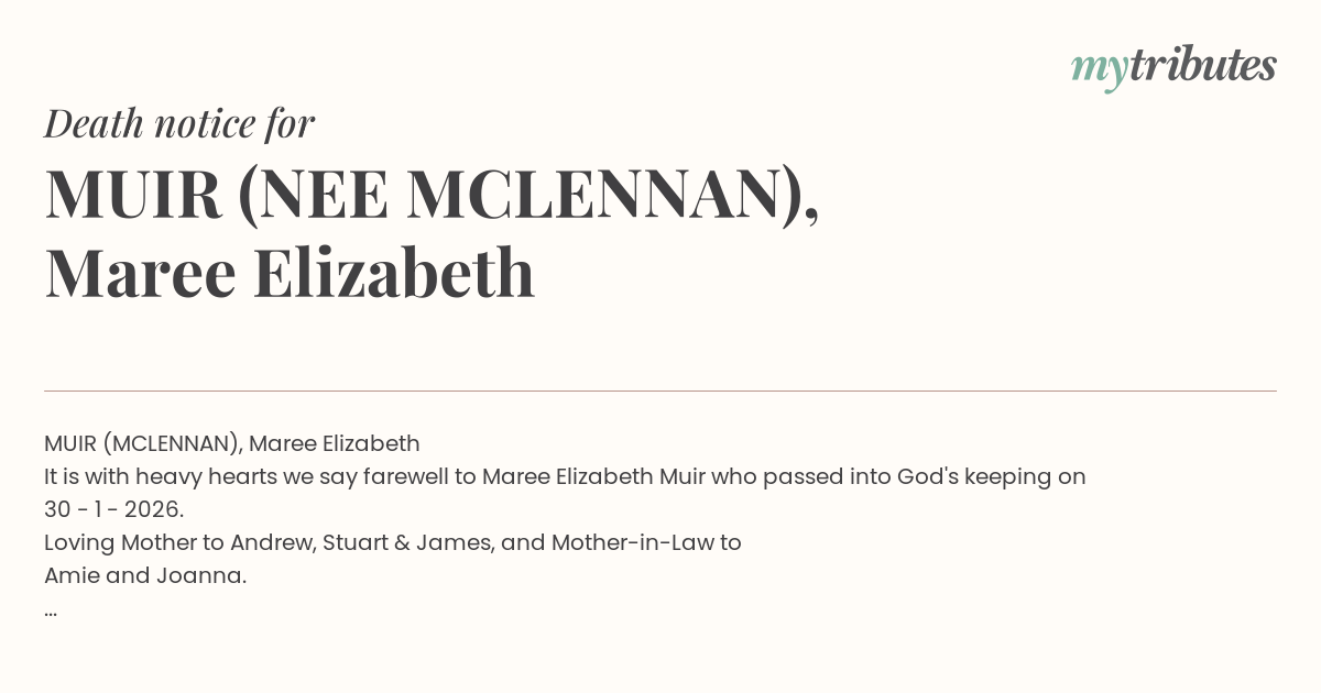 It is with heavy hearts we say farewell to Maree Elizabeth Muir who passed into God's keeping on