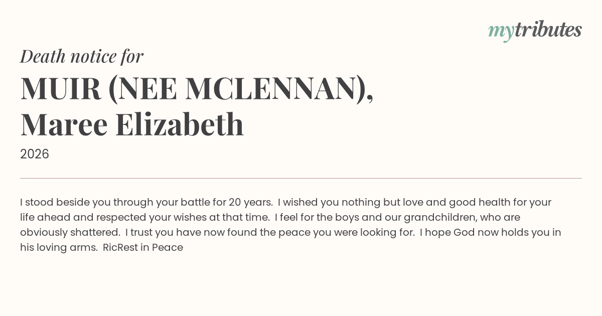19°CI stood beside you through your battle for 20 years. I wished you nothing but love and good health for your life ahead and respected your wishes at that time. I feel for the boys and our grandchildren, who are obviously shattered. I trust you have now found the peace you were looking for. I hope God now holds you in his loving arms. Ric