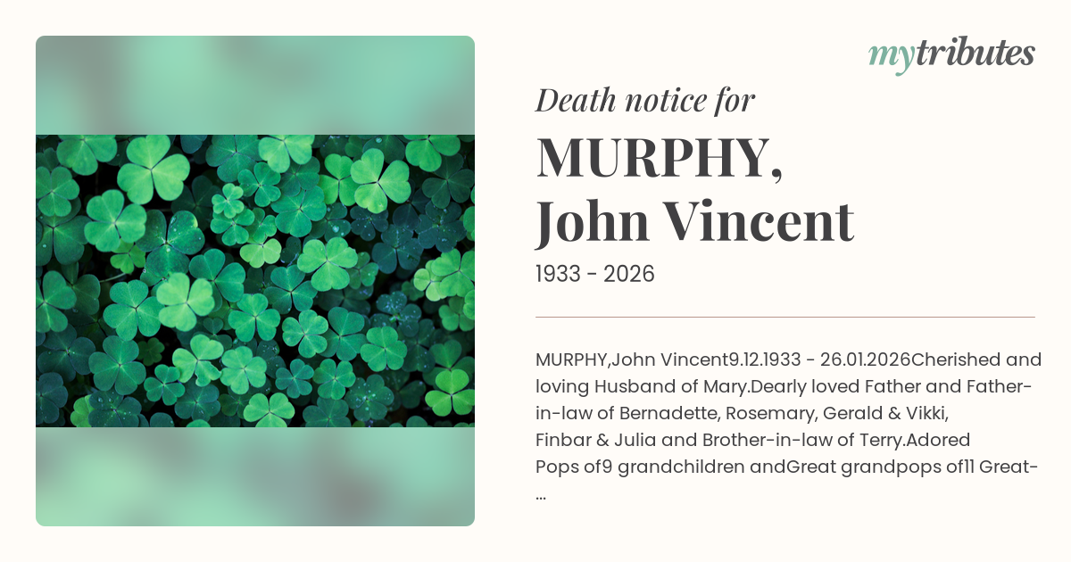 Dearly loved Father and Father-in-law of Bernadette, Rosemary, Gerald & Vikki, Finbar & Julia and Brother-in-law of Terry.