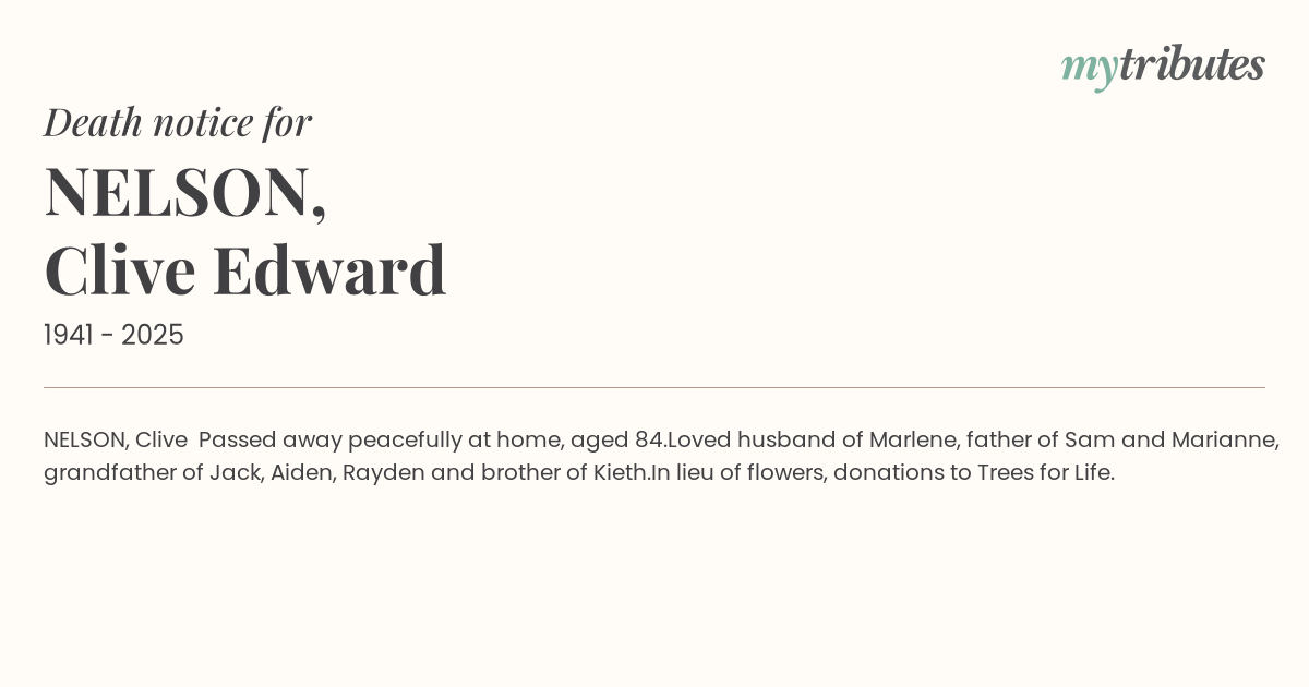 19°CNELSON, Clive — Passed away peacefully at home, aged 84.