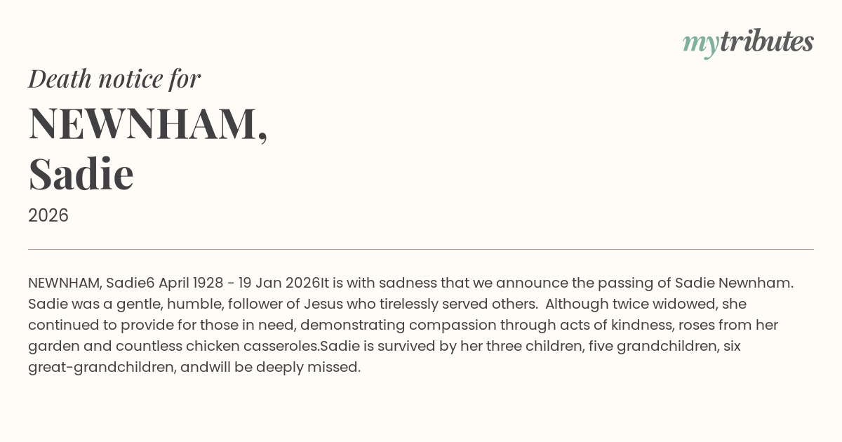 It is with sadness that we announce the passing of Sadie Newnham. Sadie was a gentle, humble, follower of Jesus who tirelessly served others. Although twice widowed, she continued to provide for those in need, demonstrating compassion through acts of kindness, roses from her garden and countless chicken casseroles.