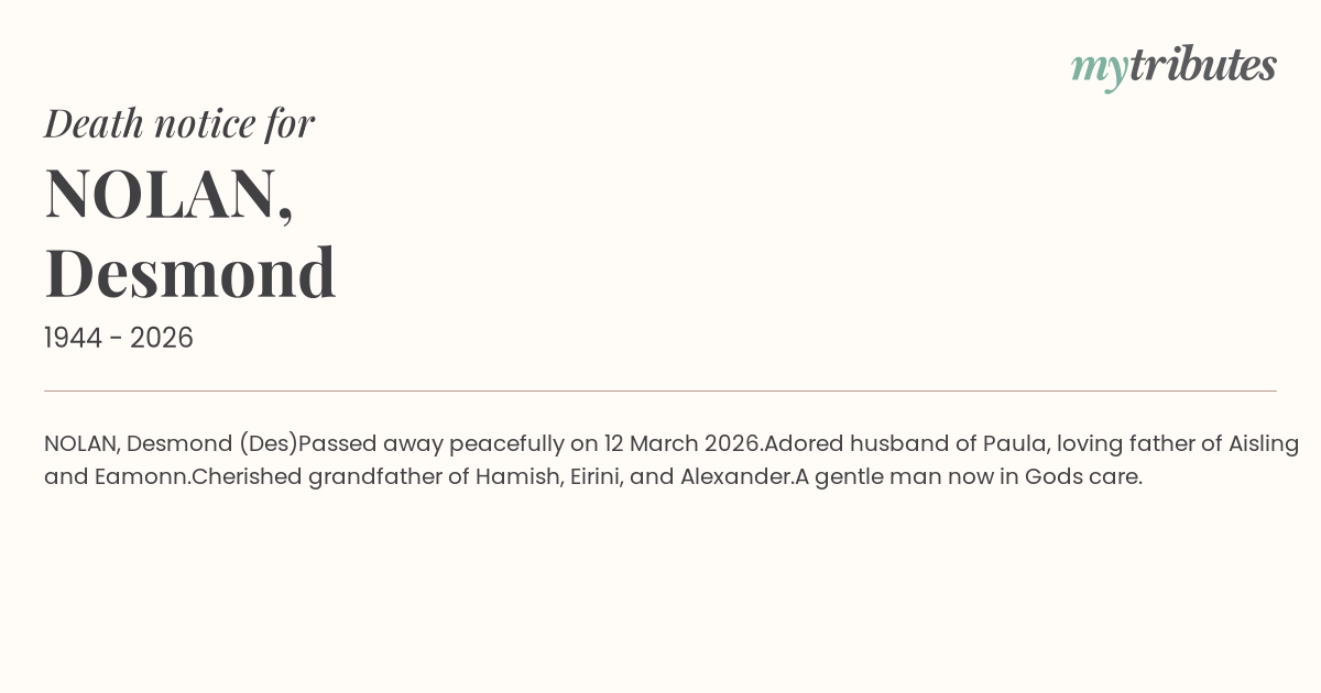 Adored husband of Paula, loving father of Aisling and Eamonn.