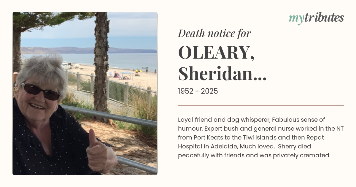 19°CLoyal friend and dog whisperer, Fabulous sense of humour, Expert bush and general nurse worked in the NT from Port Keats to the Tiwi Islands and then Repat Hospital in Adelaide, Much loved. Sherry died peacefully with friends and was privately cremated.