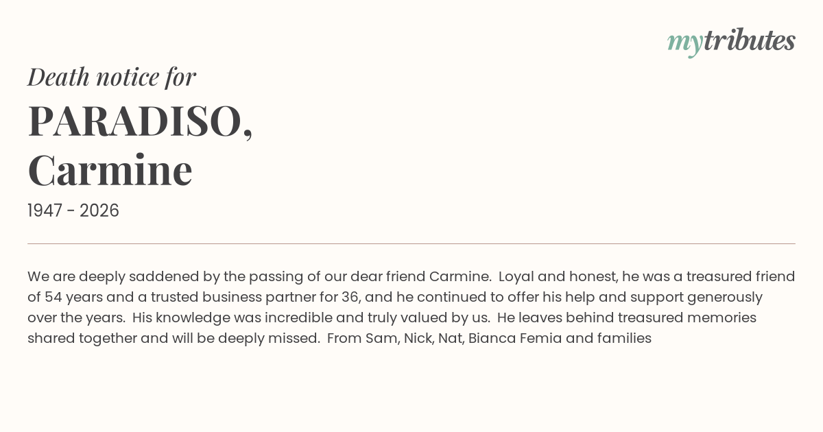 19°CWe are deeply saddened by the passing of our dear friend Carmine. Loyal and honest, he was a treasured friend of 54 years and a trusted business partner for 36, and he continued to offer his help and support generously over the years. His knowledge was incredible and truly valued by us. He leaves behind treasured memories shared together and will be deeply missed.