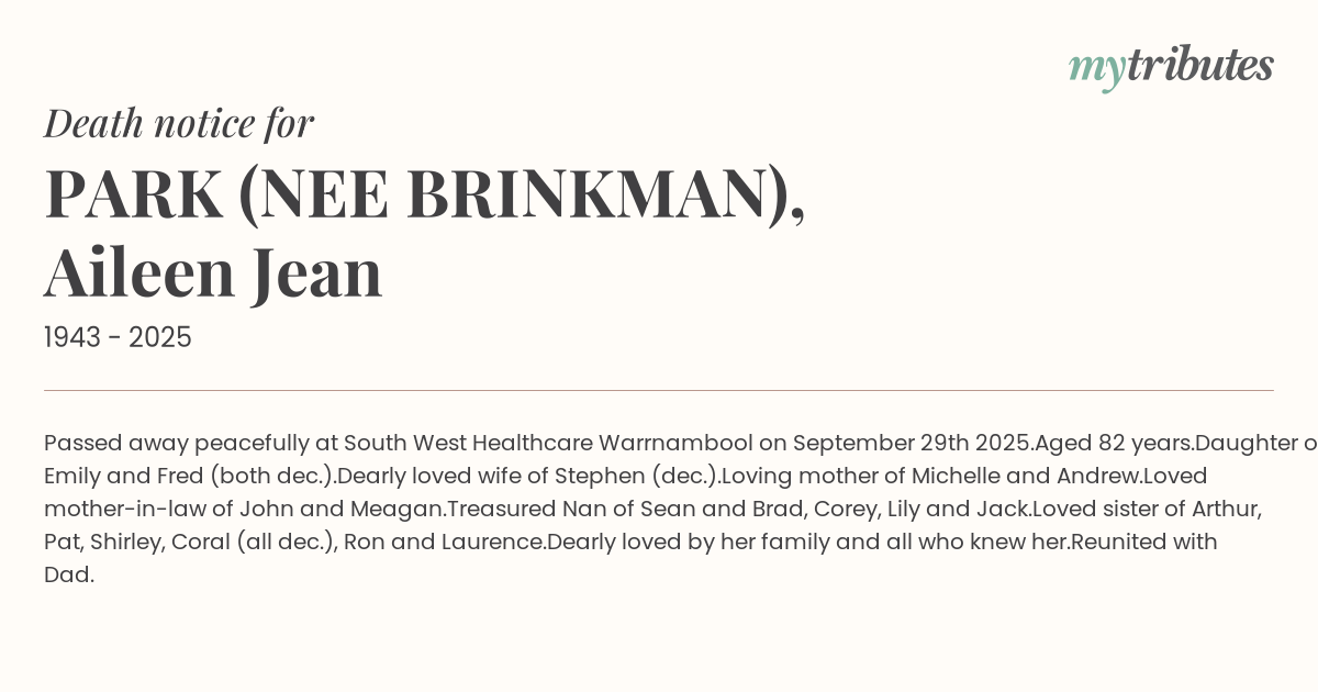 Passed away peacefully at South West Healthcare Warrnambool