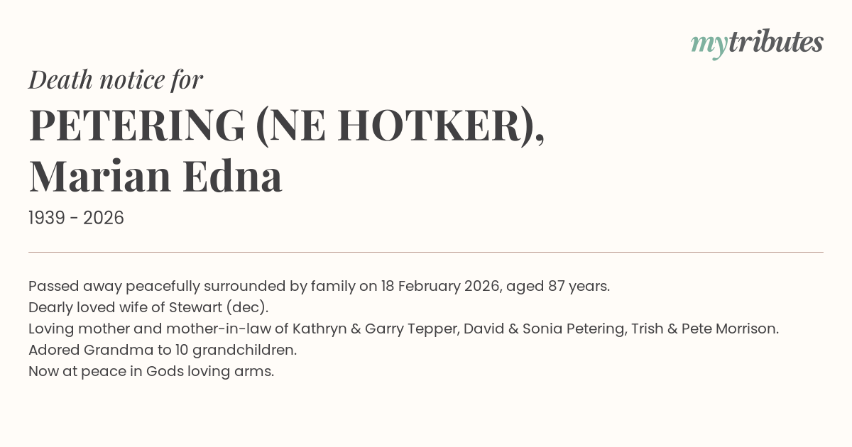 19°CPassed away peacefully surrounded by family on 18 February 2026, aged 87 years.
