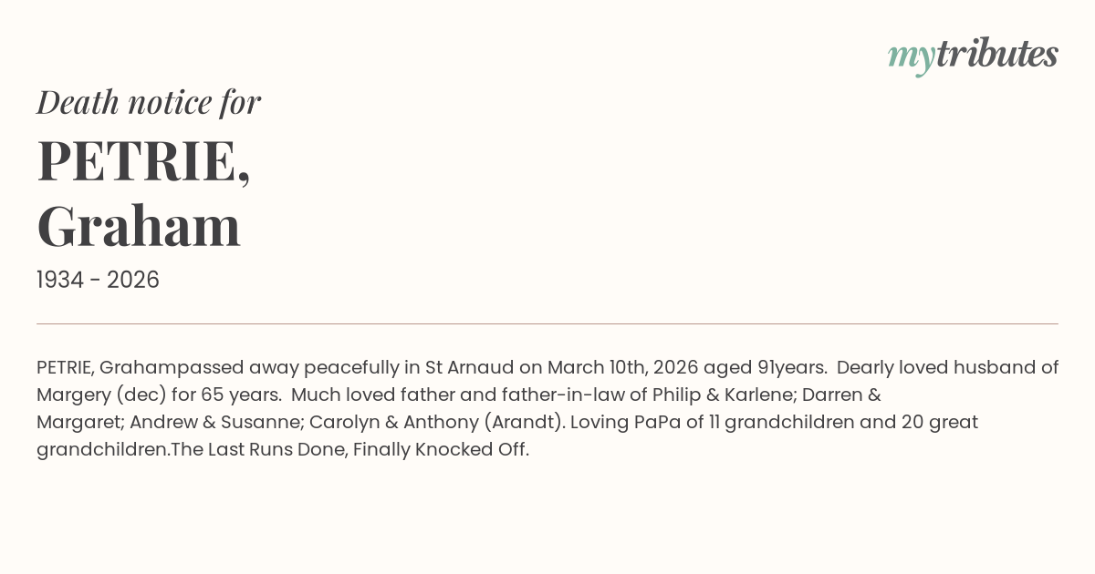 passed away peacefully in St Arnaud on March 10th, 2026 aged 91years. Dearly loved husband of Margery (dec) for 65 years. Much loved father and father-in-law of Philip & Karlene; Darren & Margaret; Andrew & Susanne; Carolyn & Anthony (Arandt). Loving PaPa of 11 grandchildren and 20 great grandchildren.