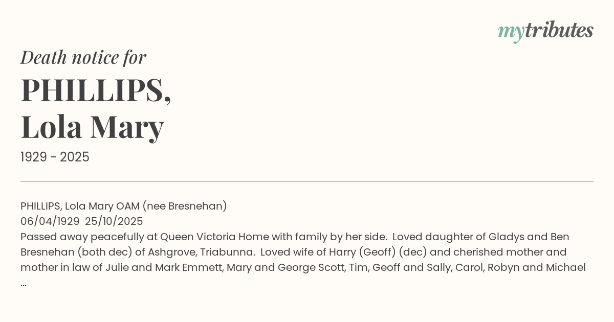 19°CPHILLIPS, Lola Mary OAM (nee Bresnehan)