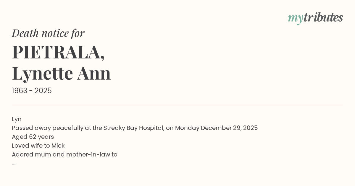 Passed away peacefully at the Streaky Bay Hospital, on Monday December 29, 2025