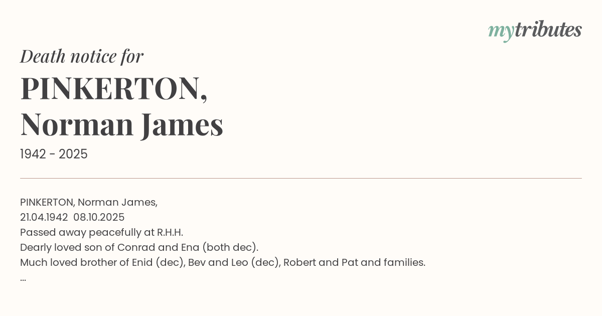 19°CPINKERTON, Norman James, 21.04.1942 – 08.10.2025 Passed away peacefully at R.H.H. Dearly loved son of Conrad and Ena (both dec). Much loved brother of Enid (dec), Bev and Leo (dec), Robert and Pat and families. Loved by many at his home and affectionately known as ‘Pinky’. Rest peacefully, our dear ‘Paddy’.