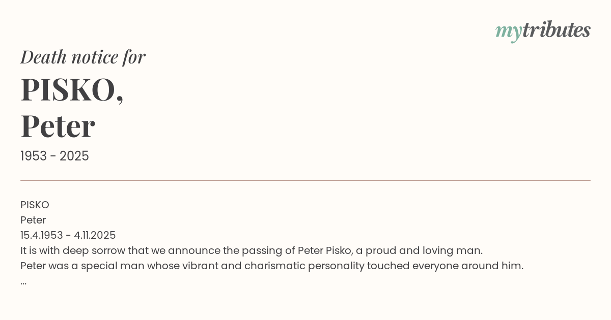 It is with deep sorrow that we announce the passing of Peter Pisko, a proud and loving man.