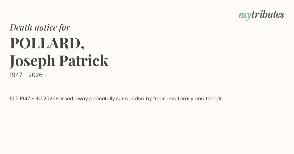 10.5.1947 - 16.1.2026Passed away peacefully surrounded by treasured family and friends.