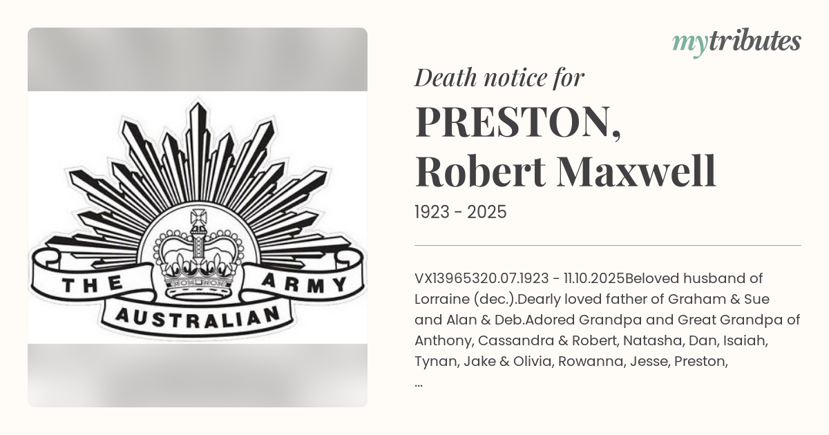 Adored Grandpa and Great Grandpa of Anthony, Cassandra & Robert, Natasha, Dan, Isaiah, Tynan, Jake & Olivia, Rowanna, Jesse, Preston, Malia & Amaya, Robert & Phoebe, Lachlan & Emma, Alexander & Rhiannon, and Rachel.