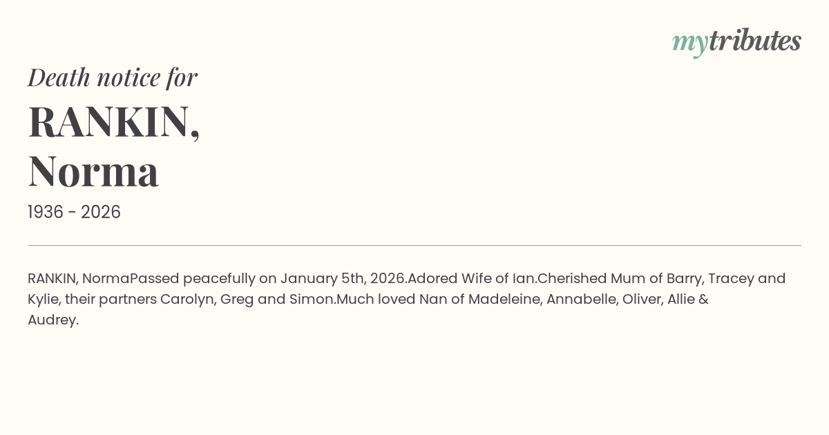 Cherished Mum of Barry, Tracey and Kylie, their partners Carolyn, Greg and Simon.