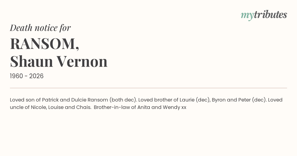 19°CLoved son of Patrick and Dulcie Ransom (both dec). Loved brother of Laurie (dec), Byron and Peter (dec). Loved uncle of Nicole, Louise and Chais. Brother-in-law of Anita and Wendy xx
