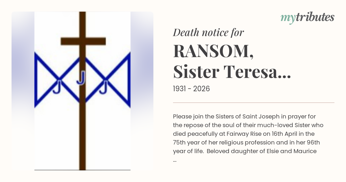 19°CPlease join the Sisters of Saint Joseph in prayer for the repose of the soul of their much-loved Sister who died peacefully at Fairway Rise on 16th April in the 75th year of her religious profession and in her 96th year of life.